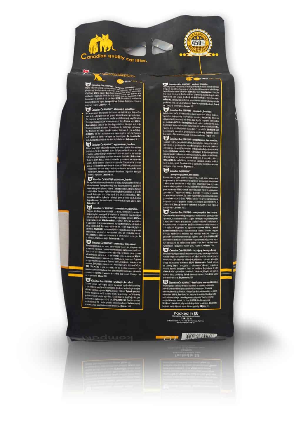 Super Benek Vám prináša podstielku Canadian Cat a to najvyššiu radu bentonitovej podstielky. Slovenský bentonit prešiel inovatívnym procesom dvojitej aktivácie s cieľom maximalizovať absorpčné vlastnosti a zároveň sme dosiahli, že granulky sú bez ostrých hrán a teda na dotyk sú veľmi príjemné. Granulky sú jemnej zrnitosti (0,4 – 2mm) svetlo šedej až bielej farby. Podstielka podľa nemeckého štandardu DIN 18132 má zvýšenú absorpčnú schopnosť až 450%. V teste spotreby obstála podstielka výborne a to so spotrebou podstielky 45cm3 pri absorbovaní 60ml tekutiny. Canadian Cat si môžete vybrať v troch rôznych vôňach a to prírodná vôňa, vôňa levandule a detského púdra „Baby powder“. Je určená pre všetky druhy mačiek každého veku.