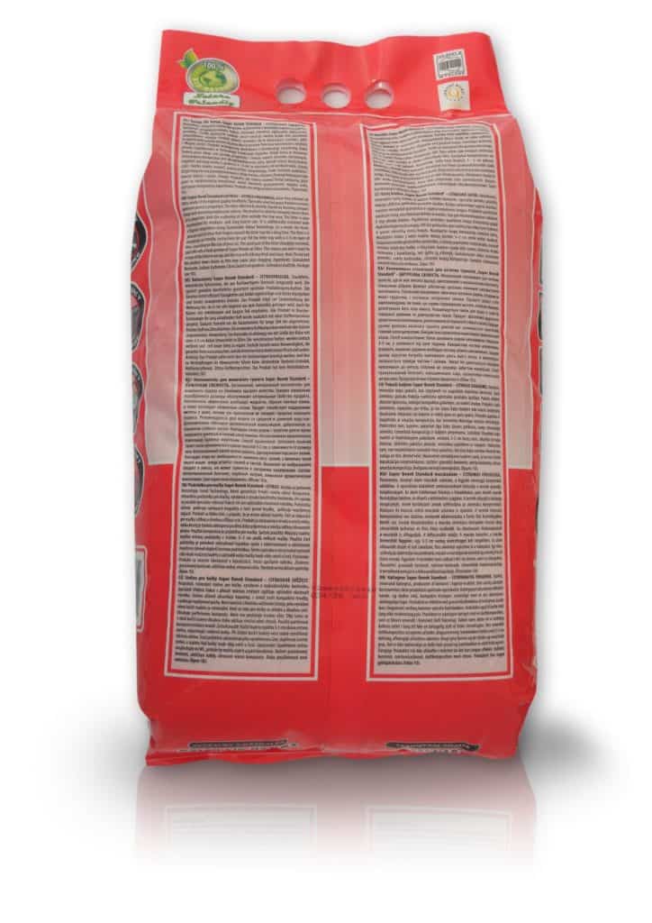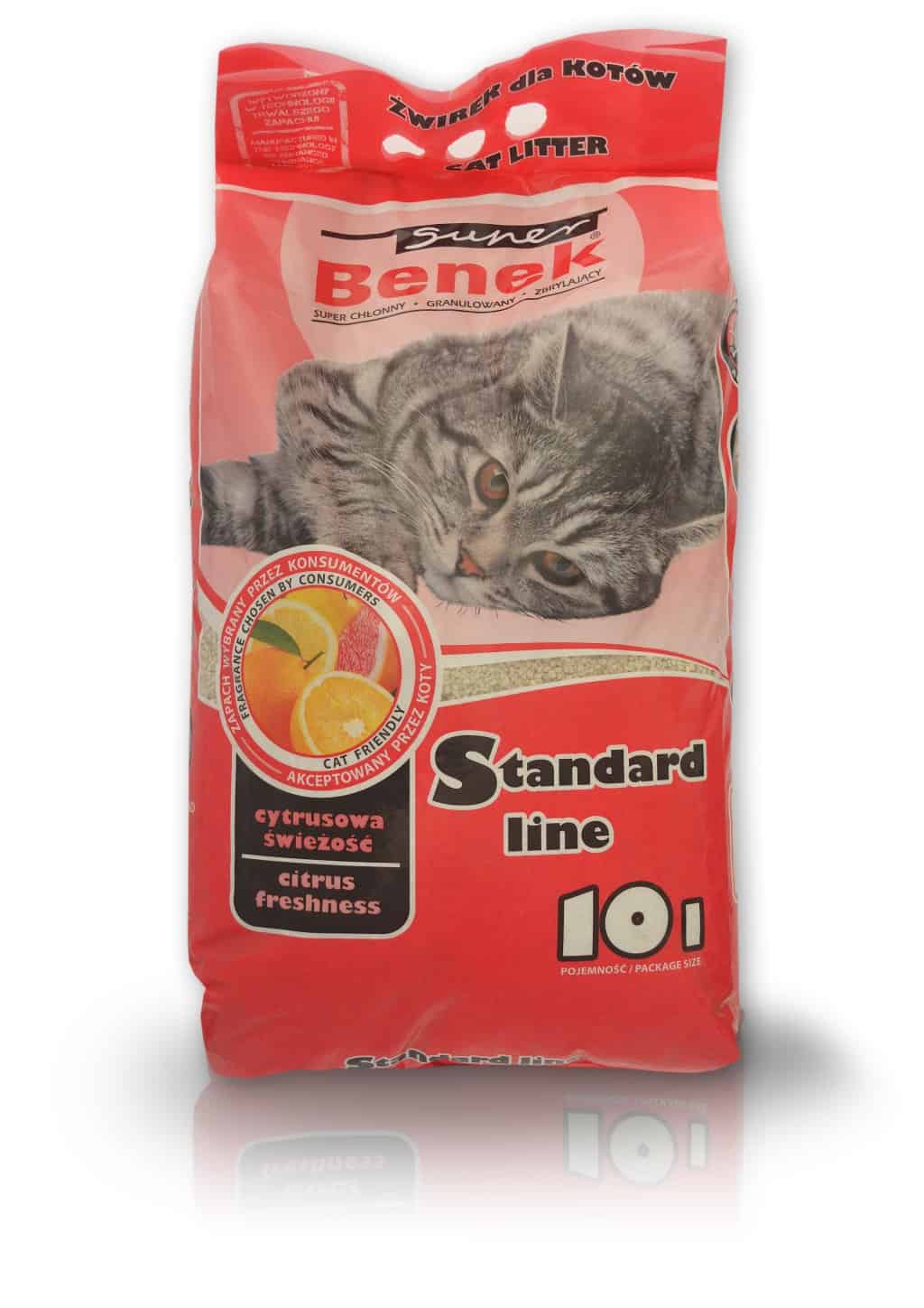 Super Benek Vám prináša bentonitovú podstielku rady Standard. Radu Standard radíme medzi základnú radu vysokej kvality so strednou zrnitosťou 1 – 4mm svetlo šedej farby. Vstupná surovina je slovenský bentonit, ktorý prešiel inovatívnym procesom aktivácie s cieľom zvýšenia jeho absorpčných vlastností. Podstielka podľa nemeckého štandardu DIN 18132 má zvýšenú absorpčnú schopnosť až 320%. V teste spotreby obstála podstielka dobre a to so spotrebou 65cm3 pri absorbovaní 60ml tekutiny (hlavne kvôli väčšej zrnitosti).