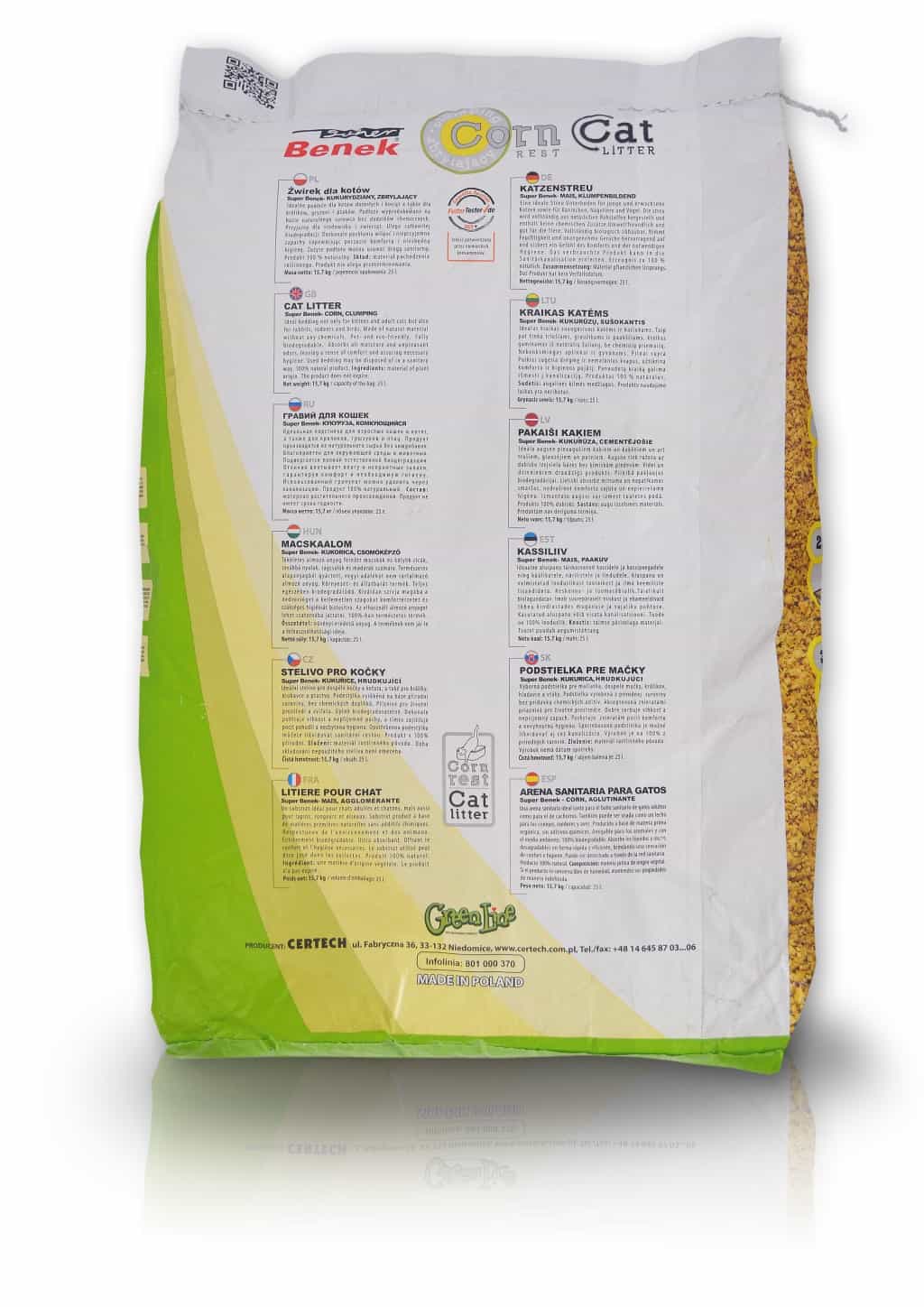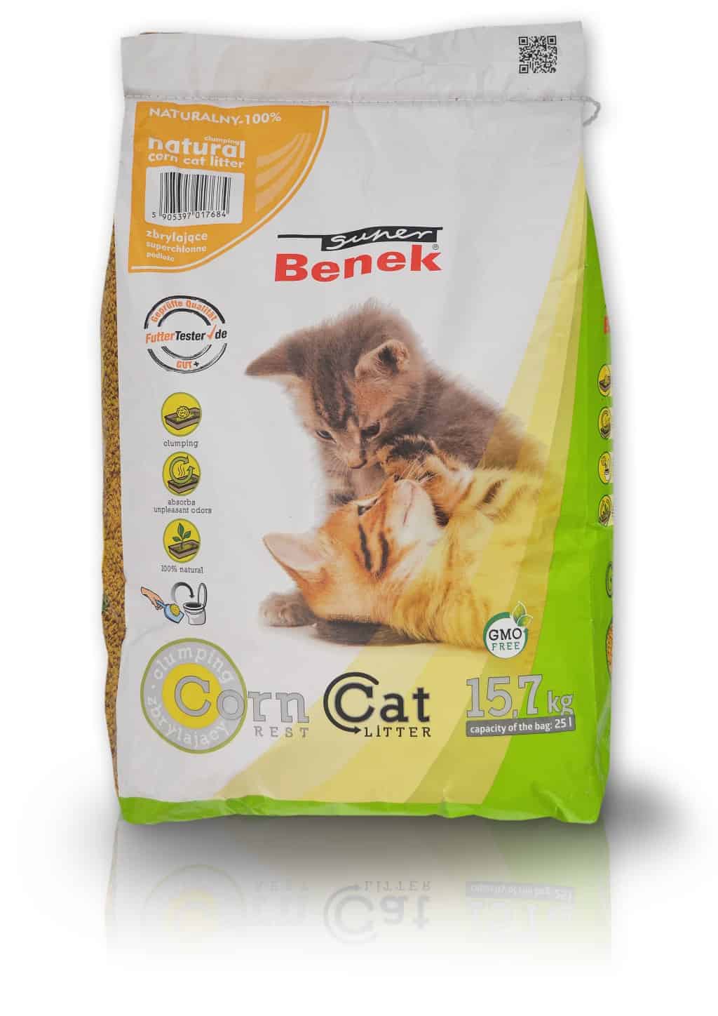 Super Benek vám prináša podstielku radu Corn Cat, vyrobenú z mletej kukurice. Corn Cat má prírodnú žltú až zlatistú farbu vo forme pevného a súčasne jemného granulátu s veľkosťou 1 – 4 mm. Tento rozmer a váha zaručujú minimálne vynášanie z toalety a zachytávanie do mačacej srsti. Pri styku s tekutinou tvorí kompaktne pevné hrudky a výborne absorbuje nežiaduce pachy. Vytvorené hrudky sa pri kontakte s veľkým množstvo vody úplne rozpadnú. Corn Cat je čisto prírodný produkt, bez akéhokoľvek pridania dodatočných chemických látok. V prípade, že vaša mačka omylom prehltne podstielku, nemusíte mať žiadne obavy, bezpečne ju vylúči. Opakovaná konzumácia podstielky môže signalizovať nedostatok živín v bežnej strave, je vhodné doplniť stravu, prípadne sa poradiť s veterinárom. Podstielka podľa nemeckého štandardu DIN 18132 má 150 % absorpčnú schopnosť. V teste spotreby dosiahla podstielka super výsledok a to so spotrebou 60 cm3 pri absorpcii 60 ml tekutiny.