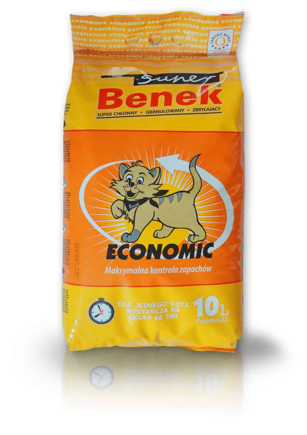 Super Benek Vám prináša bentonitovú podstielku rady Ekonomic. Radu Ekonomic radíme medzi nižšiu radu ale stále dobrej kvality s jemným až hrubým zrnom o veľkosti 0,5 – 5 mm šedej až béžovej farby. Super BenekEkonomic ponúka výborný pomer ceny a kvality. Napriek nižšej absorpcii tekutín tvorí pevné hrudky. Vstupná surovina je slovenský bentonit strednej kvality, ktorý prešiel inovatívnym procesom aktivácie s cieľom zvýšenia jeho absorpčných vlastností. Podstielka na základe testu podľa nemeckého štandardu DIN 18132 má schopnosť až 320% tekutín. V teste spotreby podstielka Ekonomic dosiahla nízke hodnoty a to so spotrebou 105 cm3 pri absorbovaní 60ml tekutiny (hlavne kvôli veľkej zrnitosti). Napriek nižšej kvalite v porovnaní s inými našimi produktovými radami, Super BenekEkonomic veľmi dobre obstojí v porovnaní s konkurenciu obdobnej kvality. Podstielka je vhodná nie len pre mačky ale aj iné doma chované zvieratá.