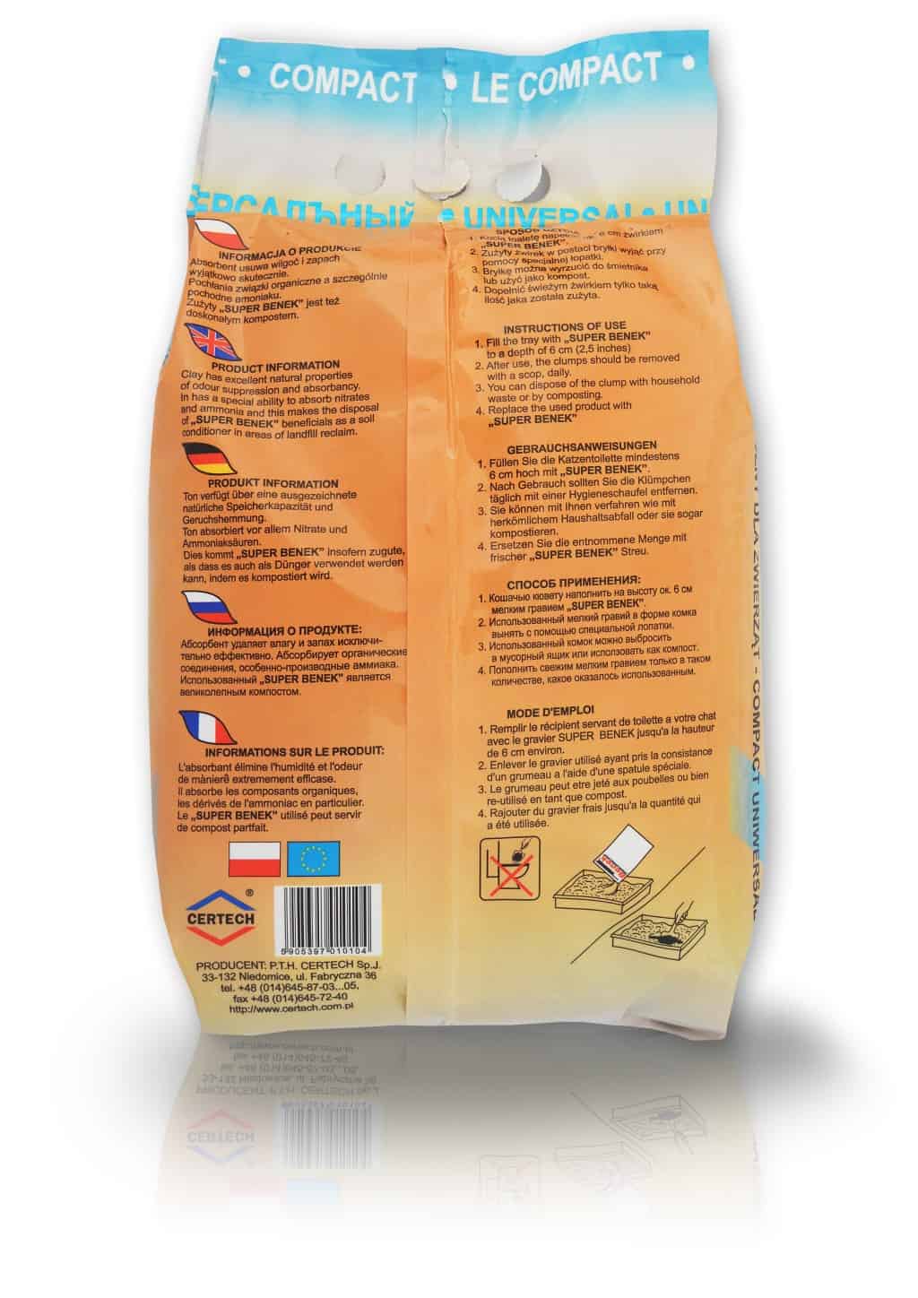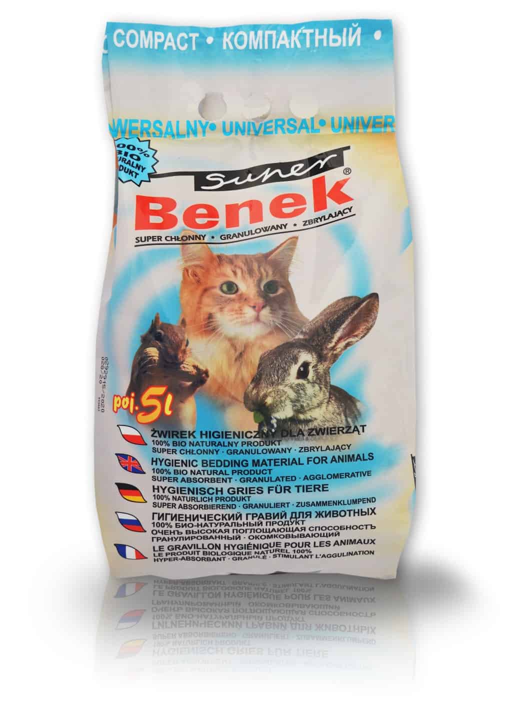 Super Benek Vám prináša bentonitovú podstielku rady Universal Compact. Radu Compact radíme medzi radu vysokej kvality s jemne hrubým zrnom o veľkosti 0,4 – 2mm svetlo šedej farby až bielej farby. Super BenekCompact je naša najpredávanejšia produktová rada hlavne kvôli optimálnemu pomeru zrnitosti, absorpcie a ceny.  Vstupná surovina je slovenský bentonit, ktorý prešiel inovatívnym procesom aktívácie s cieľom zvýšenia jeho absorpčných vlastností. Podstielka na základe testu podľa nemeckého štandardu DIN 18132 má schopnosť až 370% tekutín. V teste spotreby obstála podstielka výborne a to so spotrebou 50 cm3 pri absorbovaní 60ml tekutiny. Je určená pre všetky druhy mačiek.